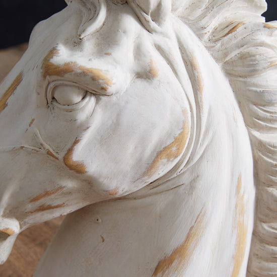 This magnificent horse head imitates the elegance that Romans used in their architecture while keeping true to contemporary style. Feature on a table or shelf for a quick sophisticated touch in a room. Item is made of resin.