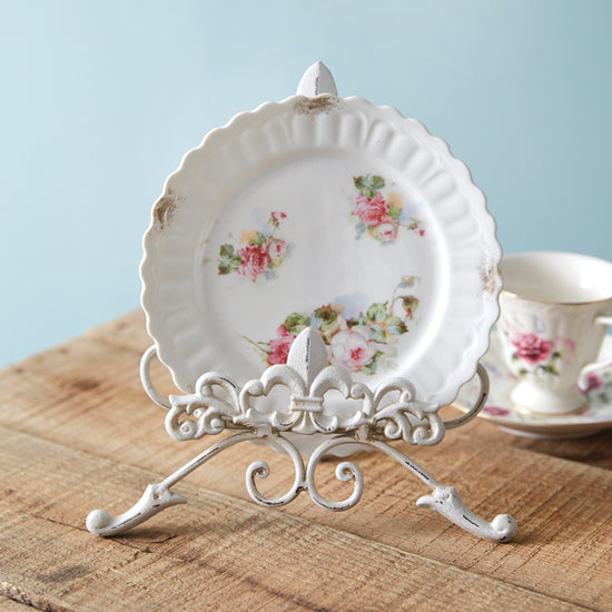 This intricate stand is the ideal home to display heirloom plates, artwork, a framed photo, or other memorabilia. Detailed with elegant curves and fleur de lis accents, this item is just as beautiful as the items you will display on it. Stand is fashioned of cast iron and is 4½''D when open.