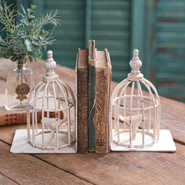 Birdcage Bookends come as a set of two. They are made out of metal and feature distressed red accents.