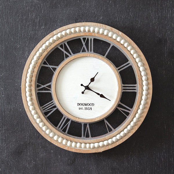 This handsome clock is made of wood and features metal numeral numbers. This item hangs using a single triangle hanger and it requires one AA battery, not included.