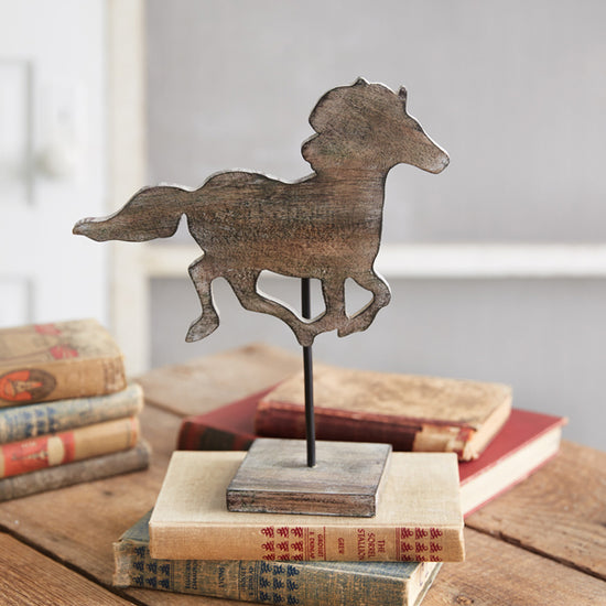 With its galloping gesture and weathered look, this horse will accentuate any western or country decor. Item is made of wood with a metal stand.