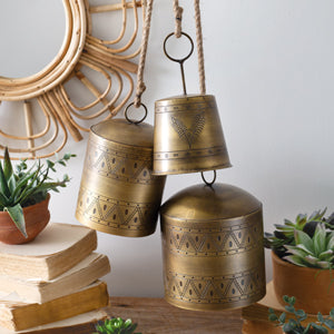 Our set of bells add a unique and boho touch to your decor. Each bell includes a clapper and a rope for hanging. Medium bell measures 4½ dia. x 7''H and small bell measures 4¼'' dia. x 8''H.